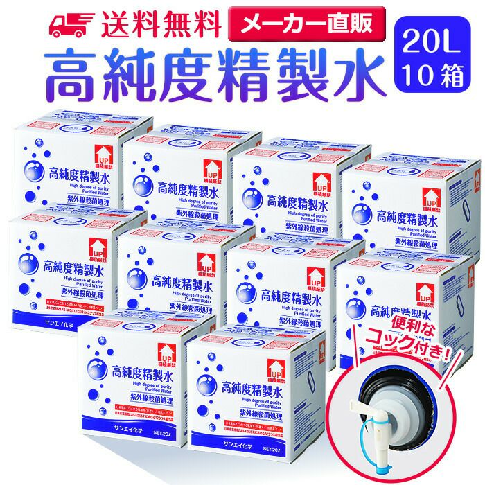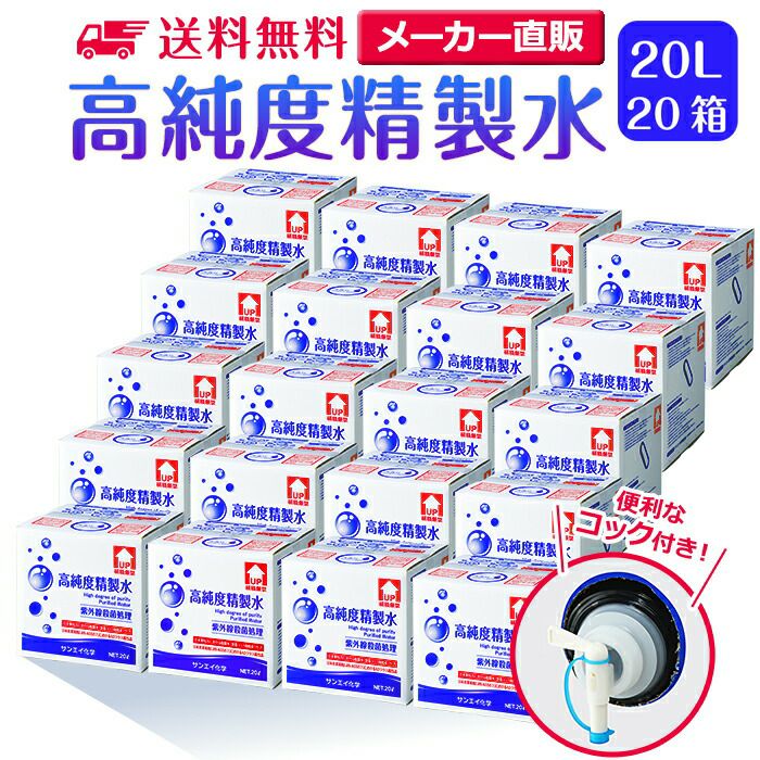 他の画像を見る サンエイ化学の高純度精製水は日本薬局方(JP)および日本産業規格(JIS)におけるA2クラスの規格をクリアした製品です。呼吸器や減菌器などの医療用、美顔器や加湿器などの蒸気用水に最適。 サンエイ化学 精製水 高純度精製水 20L×20箱セット コック付き 大容量 | 【送料無料】 20リットル 無呼吸 CPAP CPAP用 シーパップ 加湿器 アロマ スキンケア 除菌スプレー 除菌水 鼻うがい ナノケア スチーマー 化粧水 純水 蒸留水 イオン交換水 超純水 せいせいすい 日本製 販売価格 ¥ 57,211 税込 会員特別価格 ¥ 54,351 税込 詳細を見る お気に入りに登録する
